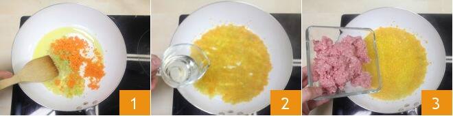 Para realizar los fideos rellenos, prepara la pasta al huevo (puedes seguir la receta que encuentras Pasta fresca con huevo (lámina y formatos)): coloca la harina sobre una tabla de amasar, en la clásica forma de fuente, luego coloca en el centro los huevos, agrega la sal y comienza a amasar con las manos, desde el exterior hacia el interior, incorporando toda la harina que se encuentra en la mesa de trabajo: deberás trabajar la mezcla, con paciencia y energía, hasta obtener una masa lisa y compacta. Envuelve entonces la pasta obtenida en film transparente y déjala reposar por aproximadamente 1 hora en un lugar fresco y seco. Mientras tanto, haz un sofrito de apio, cebolla y zanahoria poniendo a dorar estas verduras, picadas finamente, junto con un poco de aceite de oliva virgen extra 1 (para más detalles sobre cómo preparar el sofrito Cómo hacer el sofrito; si es necesario, agrega un poco de agua durante la cocción para que no se queme todo 2. Cuando todas las verduras estén bien doradas, agrega la carne picada y cocínala a fuego vivo por 5 minutos 3.