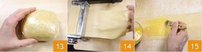 Obtén una bola que deberás envolver con film 13. Ahora toma la pasta al huevo y extiéndela ayudándote con un rodillo, luego obtén dos láminas, lo más finas posible, utilizando una máquina para pasta 14. Pincela las dos láminas con el huevo batido (esto servirá para que el relleno se adhiera mejor) 15,