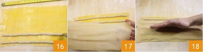 luego toma la manga pastelera y extiende tiras de relleno de unos 30 cm de largo, espaciándolas aproximadamente 1 cm entre sí 16. Deja además un borde superior e inferior de aproximadamente medio centímetro, que servirá para cerrar los fideos. Toma la segunda hoja de pasta al huevo y extiéndela sobre la primera 17. Es importante que los fideos se cierren sin dejar aire en el interior, por lo que deberás presionar con la mano, a los lados del relleno, para sellarlas y hacer salir todo el aire 18.