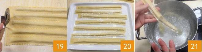 Corta ahora los fideos utilizando un cortapastas dentado 19, luego colócalos en una bandeja ligeramente enharinada 20. Mientras tanto, lleva a ebullición abundante agua salada y cocina los fideos durante 4-5 minutos, luego escúrrelos y resérvalos 21.