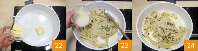 En una sartén antiadherente, derrite la mantequilla 22 y agrega los fideos rellenos: saltéalos por un par de minutos y saboréalos, agregando una mezcla de hierbas aromáticas (tomillo, orégano, cebollino y salvia) y abundante Parmesano Reggiano 23. Mezcla con cuidado, para no romper la pasta rellena integrando todos los ingredientes, luego sirve los fideos rellenos aún calientes 24.