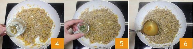 Luego déglasea con el vino blanco 4. Agrega a la carne una mezcla de romero 5 y el caldo 6, poco a poco, luego ajusta de sal y pimienta y continúa la cocción a fuego medio por aproximadamente 40 minutos.