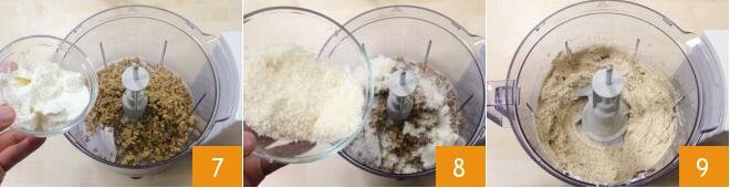 Cuando la carne esté lista, déjala enfriar, luego ponla en una batidora junto con la ricotta 7 y el Parmesano Reggiano 8. Tritura todo 9 y coloca la mezcla en una manga pastelera equipada con una boquilla lisa, de orificio pequeño.