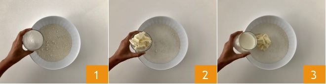 Para preparar los taralli sicilianos, lo primero es verter la harina 00 en un bol y añadir el azúcar 1. Agrega la mantequilla cortada en cubos 2 y la leche a temperatura ambiente 3.