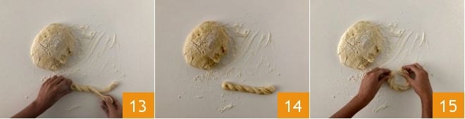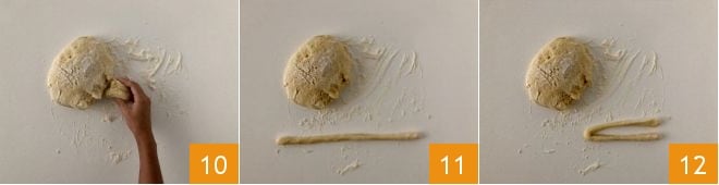 Saca un trozo de unos 75 gramos 10 y con las manos forma un cilindro 11. Luego dóblalo por la mitad 12