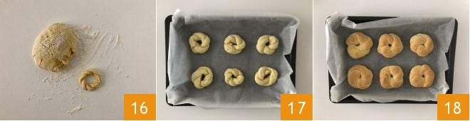 de forma que crees un anillo 16. Haz lo mismo con los demás y colócalos en una bandeja de horno forrada con papel de horno, espaciándolos entre sí 17. Hornea en horno estático precalentado a 180° durante unos 15 minutos, deben quedar bien dorados 18.