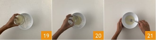 Mientras las galletas están en el horno, prepara el glaseado. Pon en un bol el azúcar, el zumo de limón 19 y el agua 20. Mezcla con una cuchara hasta obtener un glaseado homogéneo 21.