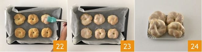 Pincela los taralli aún calientes con el glaseado 22 y déjalos secar a temperatura ambiente 23 antes de servirlos 24.