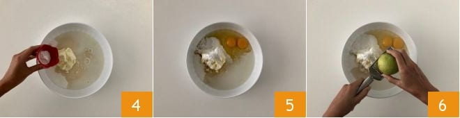 Luego, añade la levadura para pasteles junto con el amoníaco 4 y los huevos 5. Ralla la cáscara de un limón dentro 6