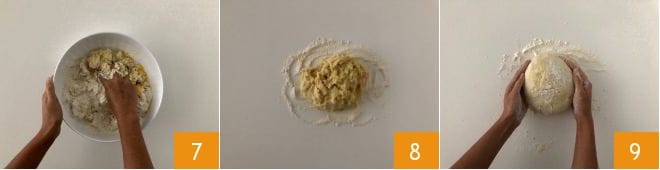 y amasa todo con las manos 7. Cuando hayas obtenido una mezcla homogénea, transfiérela a una superficie enharinada 8 y sigue trabajando hasta obtener una especie de masa quebrada pero más suave 9.