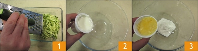 Para preparar la tarta 7 vasetti con calabacines, lo primero es rallar los calabacines con un rallador de agujeros grandes 1. Ahora vierte el yogur en un bol grande 2 para usar el tarro como unidad de medida. Añade los huevos 3 y comienza a mezclar con una batidora.