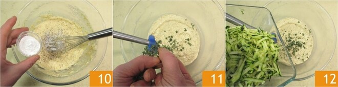 Incorpora la levadura 10 y las hojas de tomillo 11, luego añade los calabacines rallados 12 y mezcla con una espátula para incorporarlos a la masa.