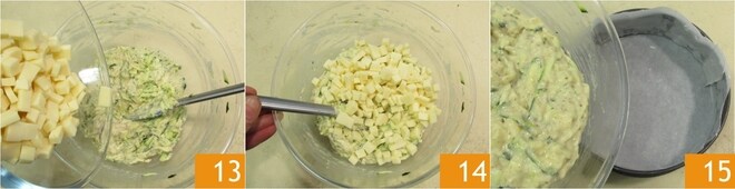 Por último, vierte los cubos de fontina 13 y mezcla de nuevo para obtener una masa homogénea 14. Forra un molde de 20 cm de diámetro con papel de horno y vierte dentro la masa obtenida 15.