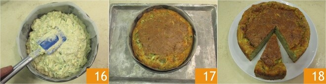 Nivela la superficie 16 y hornea en horno estático precalentado a 180° durante unos 60 minutos. Una vez cocida, sáquela del horno y deje que se enfríe un poco 17. ¡Tu tarta 7 vasetti con calabacines está lista para ser disfrutada tibia o a temperatura ambiente 18!
