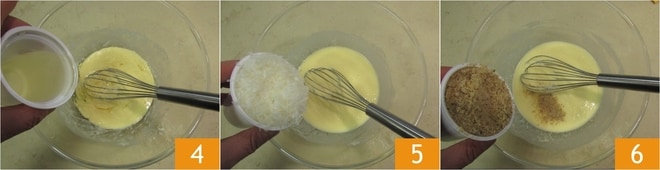 Mientras mezclas, vierte el aceite de semillas en hilo 4, luego añade el queso pecorino rallado 5 y la harina de avellanas 6.