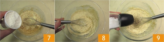 Añade también la harina 00 7, luego mezcla bien para amalgamar todo 8, sala y pimienta 9.