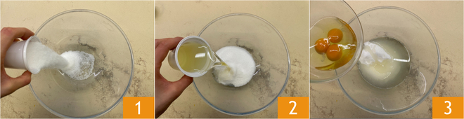 Para preparar la tarta 7 vasitos de cacao, empieza vertiendo el azúcar en un bol 1, añade el aceite 2 y luego los huevos 3.