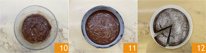 Mezcla por unos instantes con las varillas, para obtener una masa sin grumos y homogénea 10, transfiérela a un molde de 22 cm engrasado y enharinado 11. Cocina en horno estático precalentado a 180°, durante unos 40 minutos, y cuando la tarta 7 vasitos de cacao esté fría, podrás desmoldarla. Espolvorea, si lo deseas, con azúcar glas 12.