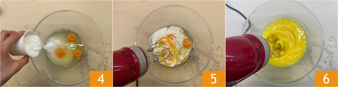 Vierte también el yogur 4 y activa las varillas 5 hasta que la mezcla esté clara y espumosa (te llevará unos 10 minutos) 6.