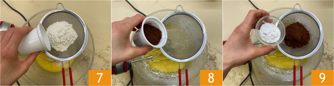Después del tiempo indicado, tamiza directamente en el bol la harina 7, el cacao 8 y la levadura para dulces, y luego añade también la sal 9.