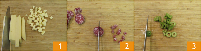 Para preparar el pastel 7 vasitos salado, lo primero es comenzar cortando el queso 1 y el salami en dados de 1 cm 2 y las aceitunas en rodajas 3.