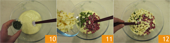 Aromatiza con la mejorana picada 10, completa con el salami, el queso 11 y las aceitunas. Aparta un poco de relleno para la superficie. Mezcla todo 12 para integrar.