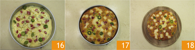 Vierte la masa en un molde desmontable de 20 cm engrasado 13. Nivela bien 14 y adorna la superficie con el relleno reservado 15.