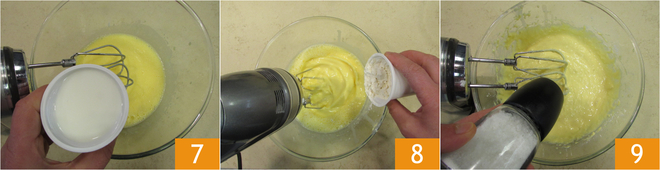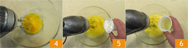 Trabaja los huevos con batidora eléctrica en un bol 4, añade el yogur, siempre con la batidora en marcha 5. Añade el aceite 6.