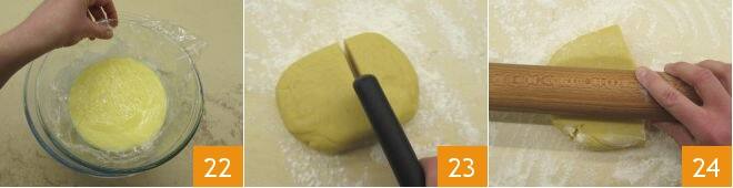 Luego cúbrela con film transparente 22, de esta forma se enfriará rápidamente sin perder color ni consistencia. Una vez fría, deja que se solidifique en la nevera durante 1 hora. Pasado el tiempo necesario, recupera la masa, toma 2/3 del bollo 23 y estira con el rodillo 24