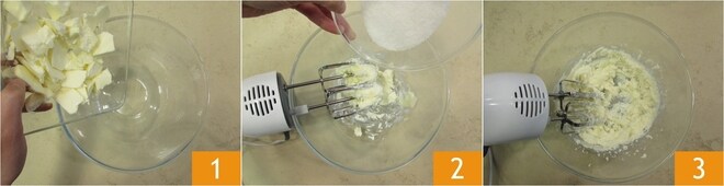 Para preparar la tarta blanda de melón, comenzad con la base: en un bol, verted la mantequilla blanda en trozos 1 y empezad a trabajarla con las varillas eléctricas. Cuando se haya ablandado, añadid el azúcar 2 y seguid batiendo la mezcla hasta que quede cremosa 3.