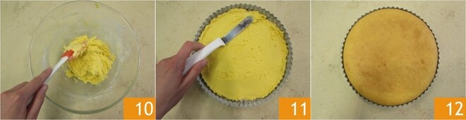 Una vez que tengáis una masa bastante densa y homogénea 10, vertedla en un molde especial de 22 cm, previamente enmantecado, y niveladla con una espátula angular 11. Hornead en horno estático precalentado a 180° durante unos 25 minutos. Cuando la tarta esté lista, sacadla del horno y dejadla templar a temperatura ambiente 12.