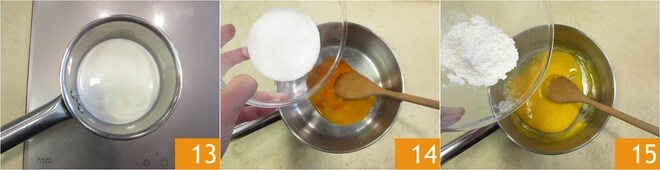 Mientras la tarta se cuece, podéis preparar la crema: verted la leche en un cazo y llevadla a punto de ebullición 13. Mientras tanto, en otro cazo, verted las yemas y el azúcar 13. Mezclad bien con una cuchara de madera y añadid el almidón 15. Seguid mezclando hasta obtener una mezcla homogénea, sin incorporar aire.