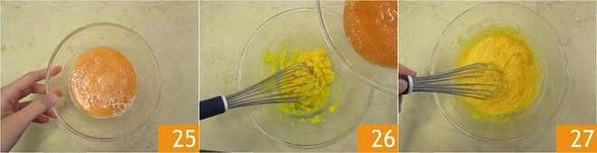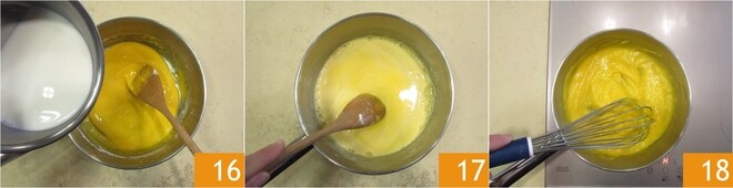 En cuanto la leche comience a hervir, verted una pequeña cantidad en la mezcla de huevos 16 y mezclad. Luego, añadid el resto de la leche y seguid mezclando 17. Volved a poner al fuego y, mezclando con unas varillas, coced hasta que la crema se haya espesado y casi vuelva a hervir 18.