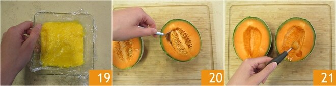 Transferid la crema obtenida a un bol y cubrid con film en contacto 19, dejad enfriar primero a temperatura ambiente y luego en el frigorífico. Cuando la crema esté fría, tomad el melón: cortadlo por la mitad y quitad las semillas con la ayuda de una cuchara 20. Con un sacabocados de tamaño 2 cm, formad unas 30 bolas 21.