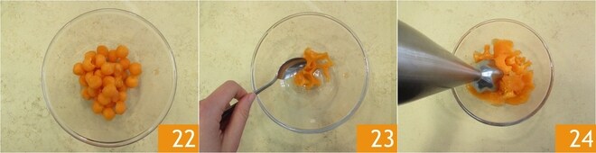 Pasadlas a un bol 22 y mantenedlas en el frigorífico hasta el momento de utilizarlas. Ahora, recuperad el resto del melón y sacad con una cuchara 100 g de pulpa. Trasladadla a un bol 23 y triturad con una batidora de mano 24.