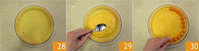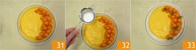 En este punto, dadle la vuelta a la base de la tarta sobre un plato, de modo que tengáis la cavidad hacia arriba 28. Verted la crema dentro y niveladla 29. Ahora, recuperad las bolas de melón y colocadlas alrededor del borde, solo en la mitad de la tarta 30.