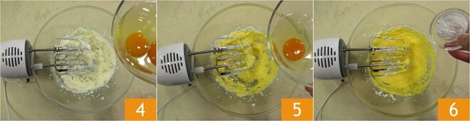 Añadid el primer huevo 4 y trabajad con las varillas eléctricas hasta que se haya absorbido bien. Después, añadid el segundo huevo y trabajad hasta que también se haya incorporado completamente. Añadid ahora la levadura 6.