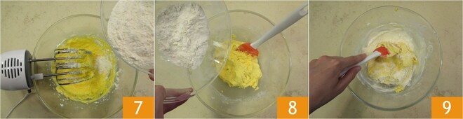 En este punto, unid una parte de la harina 7 y seguid mezclando con las varillas eléctricas 7. Luego, añadid la harina restante 8 y mezclad con una espátula 9.