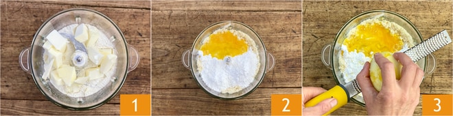Para preparar la tarta con albaricoques y crema, comience a preparar la masa quebrada con el método de la arenización. Vierta la harina en un procesador de alimentos con la mantequilla fría en trozos 1. Accione las cuchillas a intervalos, obteniendo una mezcla arenosa. En este punto, añada el azúcar, el huevo ligeramente batido 2 y la ralladura de limón 3. Accione nuevamente las cuchillas por unos segundos y a baja velocidad.