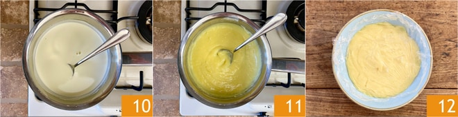 Vierta la mezcla en un cazo antiadherente y mezcle con una cuchara cocinando a fuego bajo 10. Deje que la crema pastelera se cocine, sin dejar de mezclar hasta que espese 11. Tomará pocos minutos. Transfiera la crema a un bol, cubra con papel film en contacto y deje enfriar 12.