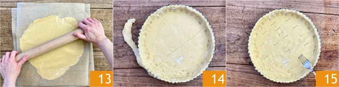 Recupere la masa quebrada y extiéndala entre dos hojas de papel de horno ligeramente enharinadas con el rodillo 13. Forre con la masa el molde para tartas de 24 cm de diámetro, previamente engrasado. Recorte el exceso de masa 14 con un cuchillo pequeño. Pinche con los dientes del tenedor 15.