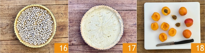 Cubra la masa quebrada con una hoja de papel de horno y vierta encima frijoles secos o esferas de cerámica 16. Cueza la masa quebrada en el horno precalentado a 180° en modo estático en la rejilla del medio del horno durante unos 15 minutos. Retire del horno, quite el papel de horno con los frijoles secos 17 y deje enfriar. Lave y seque bien los albaricoques. Córtelos por la mitad y quite el hueso 18.