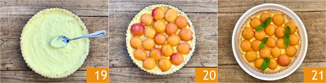 Extienda la crema enfriada en el centro de la tarta y nivele usando el dorso de una cuchara 19. Coloque las mitades de los albaricoques con la parte de la piel hacia arriba 20. Espolvoree con azúcar moreno. Hornee en el horno estático precalentado a 180°C durante unos 25 minutos de esta manera los albaricoques quedarán más suaves y ligeramente caramelizados. Retire del horno y deje enfriar completamente. Transfiera a una fuente y decore la tarta con albaricoques y crema con hojitas de menta 21.