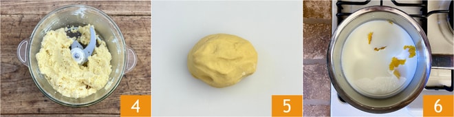 Cuando la mezcla esté homogénea 4, transfiérala a la superficie de trabajo. Compacte rápidamente con las manos formando un bloque 5 y envuélvalo en papel film. Déjelo reposar en el frigorífico por al menos media hora. Mientras tanto, prepare la crema pastelera. Vierta la leche entera en un cazo con la ralladura de medio limón y caliéntela a fuego bajo 6.