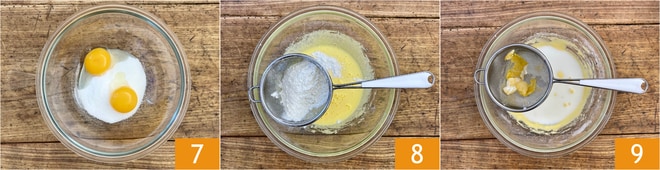 En un bol, ponga el azúcar y las yemas de huevo 7, bátalas con una batidora de mano, hasta obtener una crema lisa y clara. Vierta también la harina tamizada 8 y mezcle nuevamente para tener una mezcla homogénea. Añada, poco a poco, la leche caliente, colándola con un colador 9 y mezcle la crema con la batidora de mano.