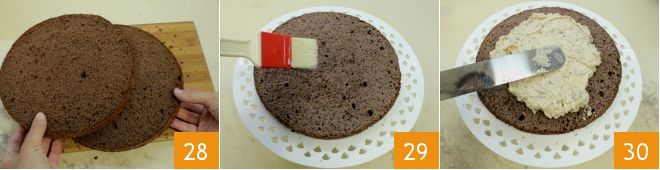 Ahora que has obtenido otros dos discos 28, estás listo para montar la tarta: coloca en una base o en un plato de servir la base del bizcocho. En un cazo, calienta la leche que servirá para el almíbar y cuando esté caliente, úntala por toda la superficie del bizcocho, ayudándote con un pincel de cocina 29. Luego vierte parte de la crema sobre la base y distribúyela de manera uniforme ayudándote con una espátula 30.