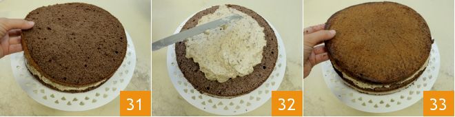 Cubre con otro disco de bizcocho 31 y úntalo con el almíbar; continúa con otra capa de crema 32 y finalmente coloca el último disco de bizcocho 33, untándolo también con el almíbar. Deja la tarta un momento en un lugar fresco.
