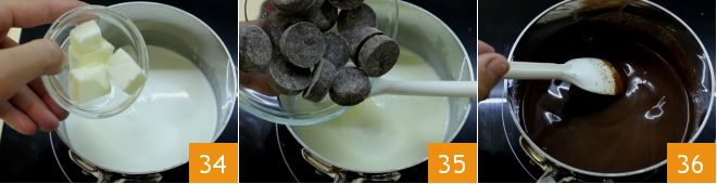 Pasa ahora a preparar la crema ganache para decorar la tarta. En un cazo vierte la nata fresca líquida y añade la mantequilla ablandada 34. Remueve con una cuchara de madera y cocina a fuego muy bajo hasta que esté a punto de hervir. Cuando la nata con la mantequilla esté a punto de hervir, añade el chocolate negro 35. Sigue removiendo para derretir el chocolate a fuego bajo 36. Luego retira la mezcla del fuego y déjala enfriar un poco.