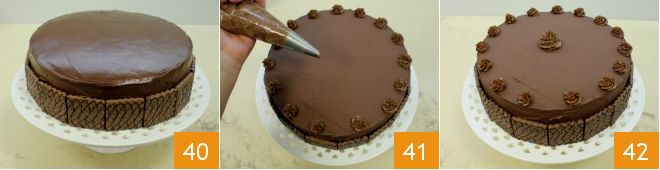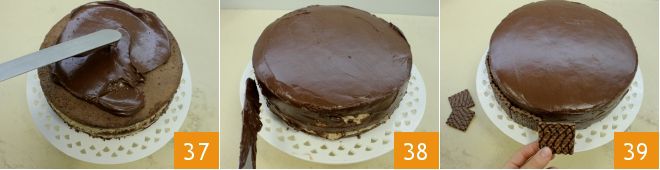 Cuando la crema ganache a temperatura ambiente haya alcanzado una consistencia fluida, puedes empezar a cubrir la tarta; vierte la ganache en el centro de la tarta y con una espátula extiéndela sobre la superficie de la tarta 37 y alrededor 38. Ahora puedes pasar a decorar con los barquillos cubiertos de chocolate con leche colocándolos alrededor de toda la circunferencia de la tarta 39. Además de mejorar la estética, los barquillos colocados en el exterior serán útiles para porcionar más fácilmente tu tarta.
