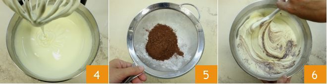 Monta hasta obtener una mezcla esponjosa y homogénea 4; necesitarás al menos 15-20 minutos para que la mezcla incorpore suficiente aire para hacer que el bizcocho se hinche durante la cocción. En este punto, detén las varillas; en un bol tamiza la harina, la fécula (o el almidón de maíz) y el cacao juntos 5, luego añade los ingredientes secos a la crema mezclando con una espátula de abajo hacia arriba para amalgamar bien sin desmontar la mezcla 6.